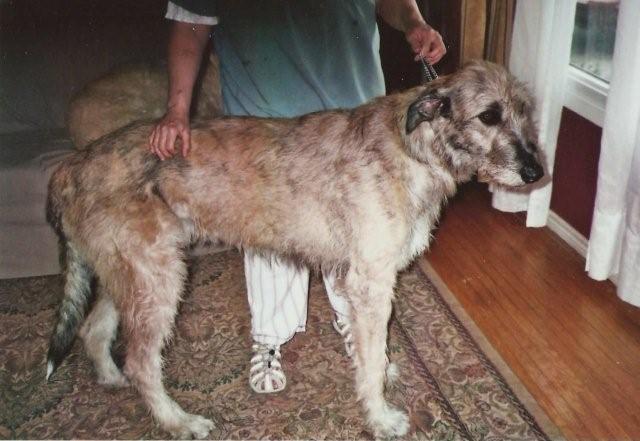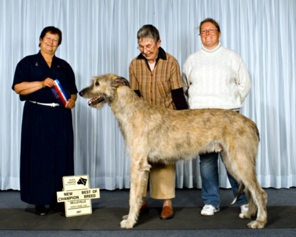 My Aru  was a beautiful male, in temperament and conformation.  Though he had very good conformation and did some exciting placements at various Irish Wolfhound Specialties he never really put himself out to be shown.  However, as with most Irish Wolfhounds he did it to please his mistress and after his last successful win I decided to grant his wish of an “early retirement”, in which he took control of the “pack” to become my Alpha male.  The following is a picture of my Aru receiving Winners Dog, Best of Winners, Best of Breed to finish his Canadian Championship in October of 2007 under Judge Elaine Whitney at the All Breed, Belleville and District Kennel Dog Show.